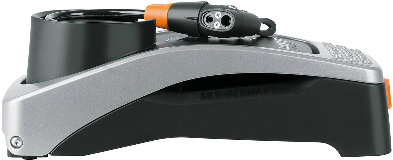 La bomba de pie Airstep de SKS combina las virtudes de una bomba de pie clásica con la tecnología más avanzada. Materiales de primera calidad, un diseño sofisticado y características de fácil manejo, como el gran manómetro, el espacio de almacenamiento integrado para la manguera en espiral y el cabezal MultiValve para todo tipo de válvulas, le dan a la bomba un aspecto completamente nuevo e innovador. Si se maneja la barra de aluminio de forma ergonómica, en una postura erguida cuidando la posición de la espalda, se puede alcanzar la mayor capacidad de bombeo efectiva posible de hasta 7 bar. Tras el bombeo, el soporte se vuelve a plegar y se bloquea mediante un interruptor. Así, la bomba compacta puede guardarse ahorrando espacio gracias al soporte de pared.