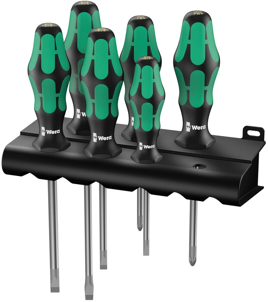 Juego de destornilladores Kraftform Plus de 6 piezas con cuchillas redondas de punta láser y estante que se puede fijar a la pared. Esto garantiza un almacenamiento ordenado y un acceso rápido.