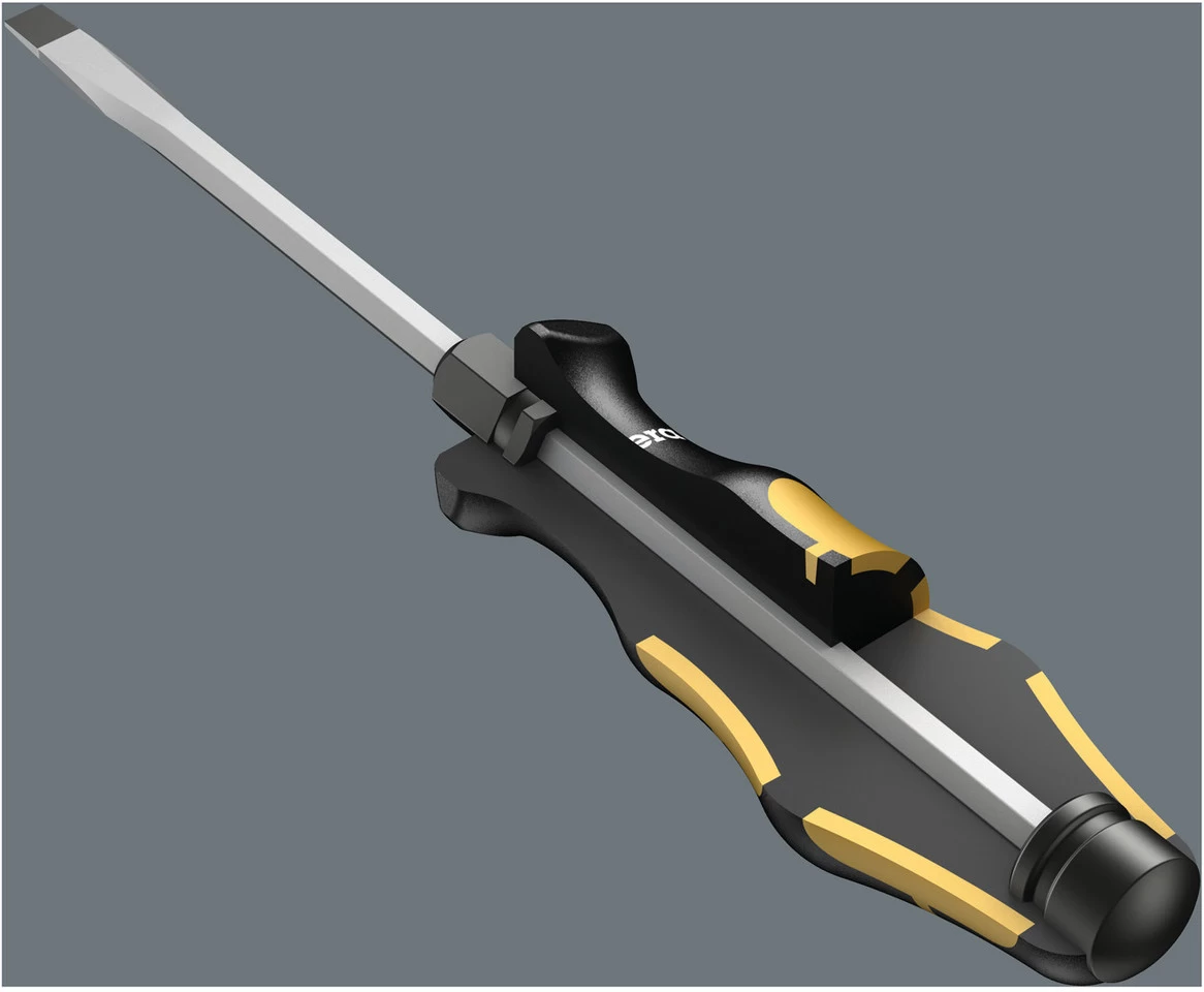 Gracias al mango Kraftform multicomponente, siempre tendrás los destornilladores bien sujetos en la mano. Wera fabrica el mango Kraftform de varios materiales con diferentes propiedades. Se utiliza un plástico resistente para el núcleo, que mantiene la hoja de forma segura incluso bajo altas cargas. Para las zonas de contacto de color se utiliza un material más blando. El material tiene una mayor resistencia a la fricción y permite la transmisión de mayores fuerzas. Las zonas negras, con su superficie más dura, evitan que la mano se «pegue» al mango. Así, es posible un rápido cambio de manos.